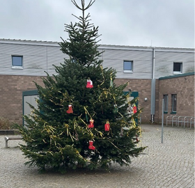 Ein festlich geschmückter Tannenbaum auf dem Schulhof sorgte in der Adventszeit für eine stimmungsvolle Atmosphäre und begleitete uns durch die letzten Schultage vor den Ferien.