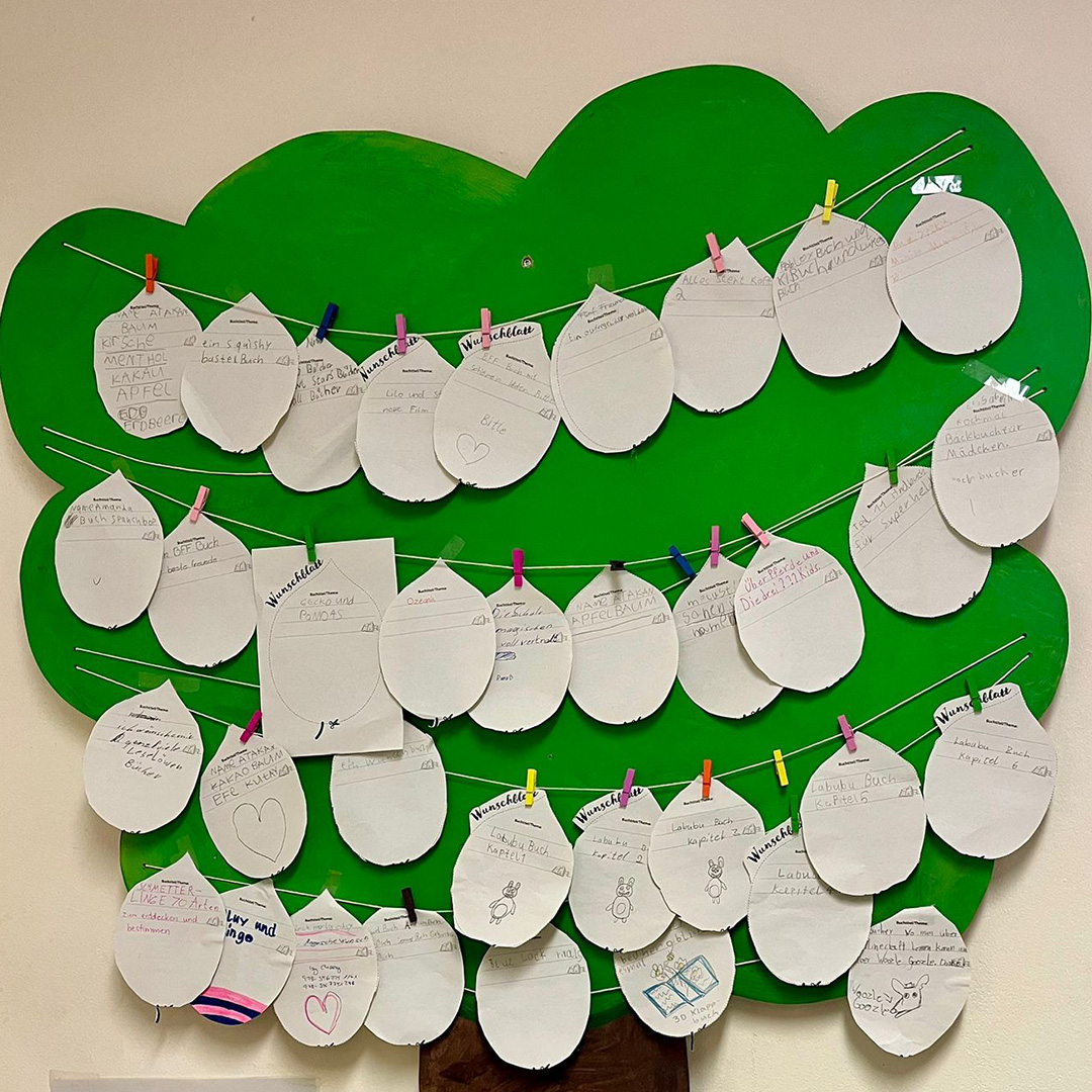 Auf dem Frühlingsfest 2025 wurde unser Wunschbaum feierlich eingeweiht. Seitdem steht er in der Schulbücherei und unsere Kinder dürfen dort ihre Bücherwünsche aufhängen – und wir freuen uns sehr, wie begeistert sie dieses Angebot annehmen.
